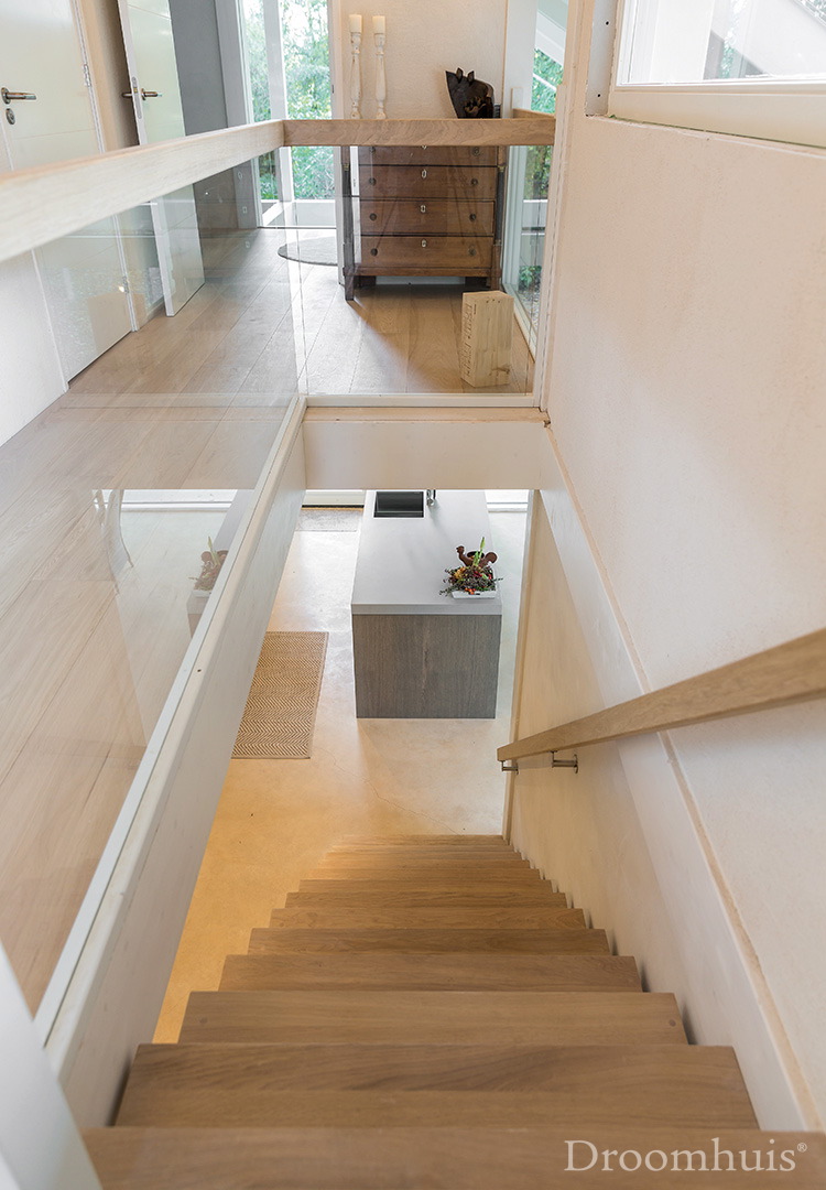 “Voor de bouwwijze is er gekozen voor ons Paal & Balk-systeem. De houten draagconstructie van robuuste balken is binnenshuis zichtbaar, waardoor we een verbinding met natuur creëren (Biofilie). Het glas is direct tussen de houten balken van de constructie geplaatst voor een optimaal binnen-buiten effect. Alleen bij openslaande ramen en deuren worden kozijnen toegepast. De isolatie is optimaal. Voor de ramen triple glas. RC-waarden voor de buitenwanden en dak van 4.7 tot 6. Het ‘damp open systeem’ voor de buitenwanden zorgt voor een prettig leefklimaat. We passen natuurlijke en ecologische isolatiematerialen toe: hennep, houtvezelplaten en vlas. Op deze wijze bouwen we ecologisch verantwoord en creëren we bovendien een gezond leefklimaat voor de bewoners. Slaapkamers op de verdieping zijn ruimtelijk door de hoogtewerking tot in de nok. De constructie van de sporenkap is bewust zichtbaar. Buitenwanden zijn voor een deel bekleed met donker gebeitst vurenhout. Een keramische vlakke dakpan geeft het geheel een strak aanzicht. De veranda is een mooie overgang van binnen naar buiten. De combinatie van een zandkleurige betonvloer, de grote glaspartijen, het robuuste hout en de met leem gestuukte wanden geeft een perfecte balans. Kortom, een houten boswoning – volledig in harmonie met de omgeving.”