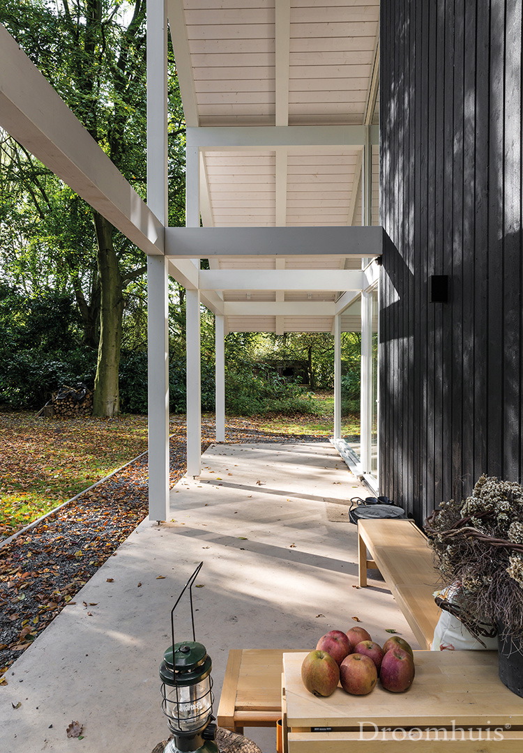 Tussen het groen van de bomen schuilt de woning van Lars en Lilianne. De zwarte basis van de woning en het bijgebouw worden geaccentueerd door het witte lijnenspel van het paal en balk systeem. Binnen zijn het groen en het natuurlijke licht onderdeel van het interieur door de grote glas parijen. Ook voelt het interieur warm en natuurlijk aan door het zachte kleurenpallet.